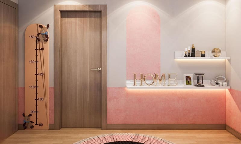 Hệ vách lam gỗ ốp tường cùng tủ chứa đồ được lựa chọn cùng một gam màu, tạo sự liền mạch và thống nhất cho không gian.
