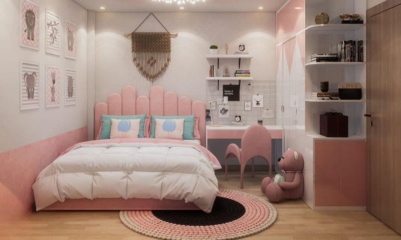 Nội thất phòng ngủ cho bé được thiết kế với màu sắc tươi sáng và trang trí bằng các họa tiết đáng yêu.