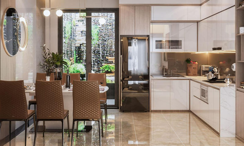 Thiết kế bếp liên thông ngày càng trở nên phổ biến trong các nhà phố hiện đại.