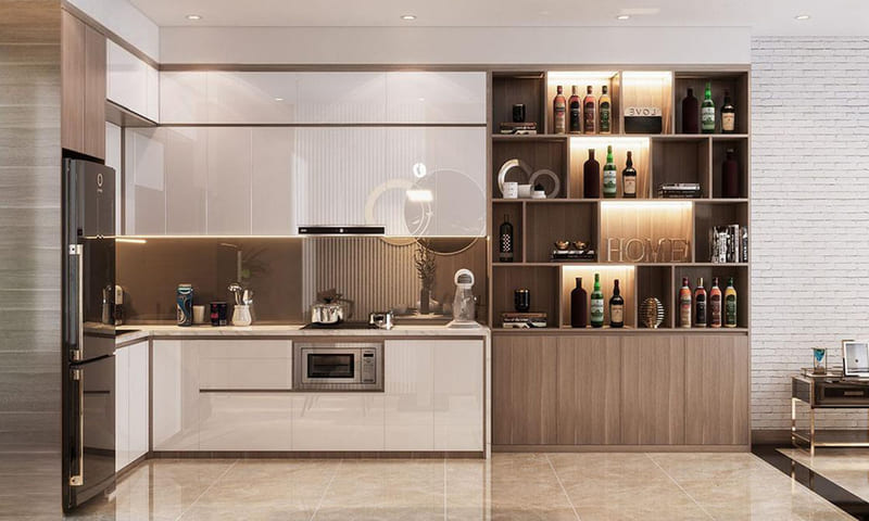 Các kệ tủ được làm từ gỗ ép, với sự kết hợp hài hòa giữa màu nâu và trắng, là nơi để vật dụng nấu ăn tiện lợi.