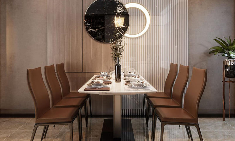 Bộ bàn ăn mặt đá màu trắng kết hợp cùng 6 chiếc ghế màu nâu sậm, tạo nên không gian hoàn hảo và độc đáo.
