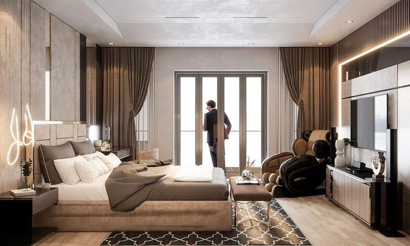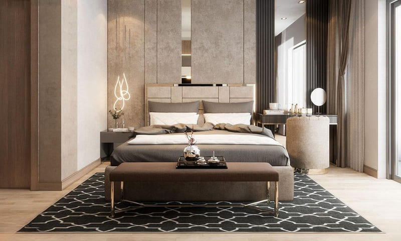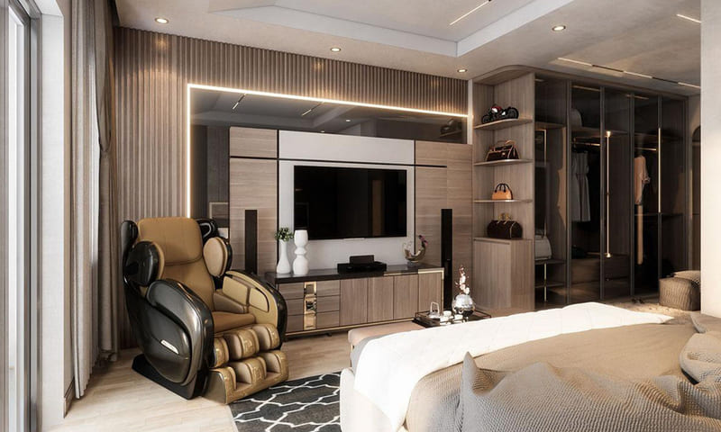 Phòng ngủ chính được thiết kế với sự cân nhắc tỉ mỉ, đảm bảo vừa đáp ứng công năng và thẩm mỹ, đồng thời mang lại sự thoải mái và tiện nghi cho chủ nhà.